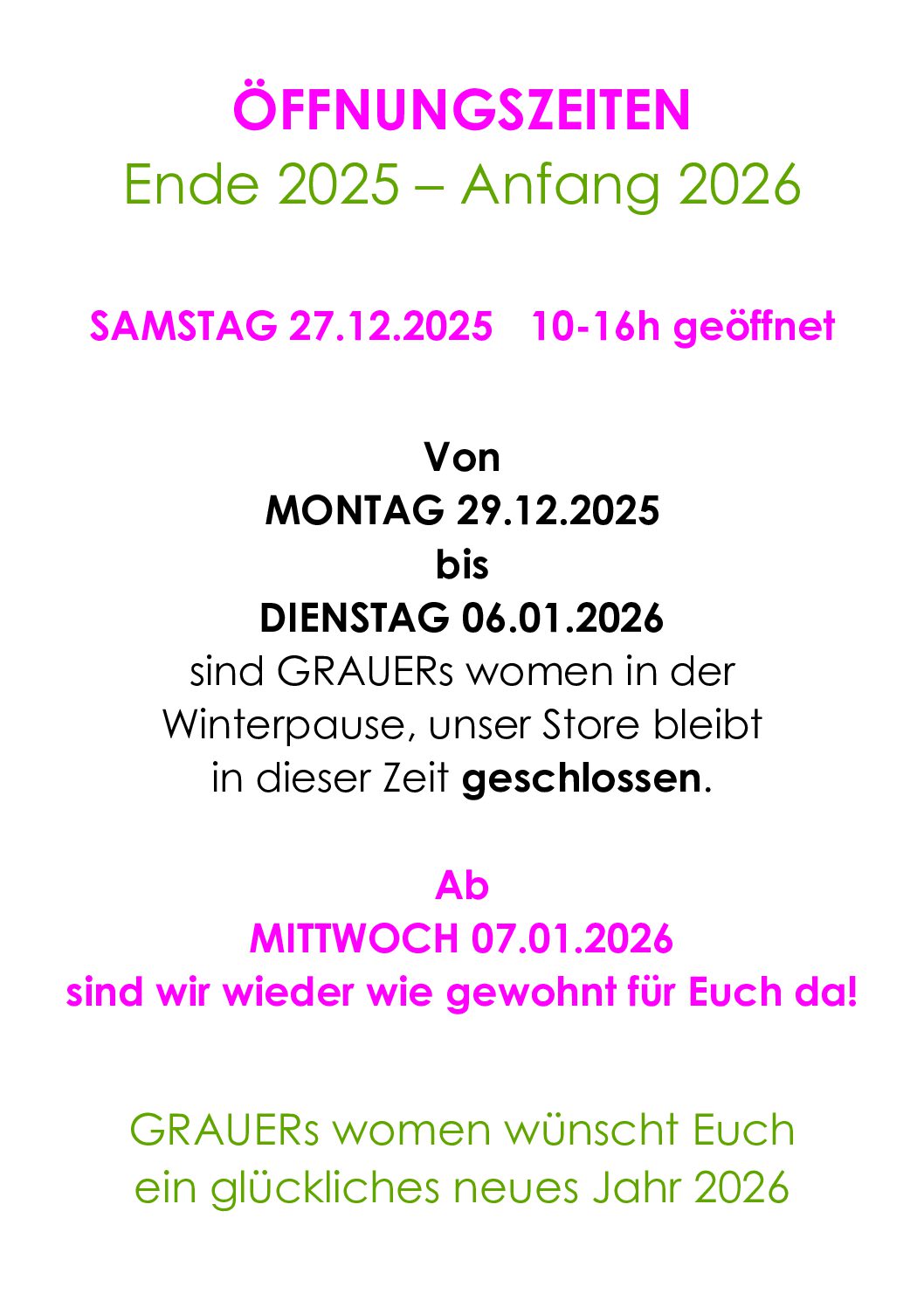 Wollt Ihr bei GRAUERs women schon mal einen Blick auf die neue Mode werfen? AUF JEDEN FALL?! Das sind unsere aktuellen Öffnungszeiten bis Anfang 2026!