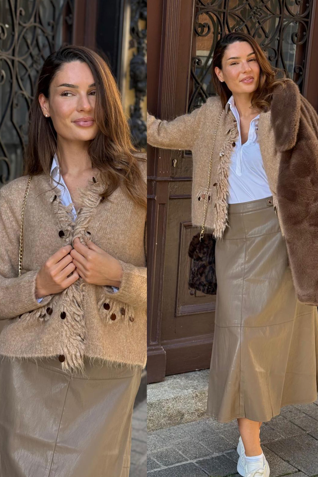 WARME TÖNE! Die Strickjacke mit den angesagten Fransen passt so wunderschön zu dem beigen VEGGIE-Rock in MIDI-Länge, die flauschige Teddy-Jacke passt perfekt dazu!